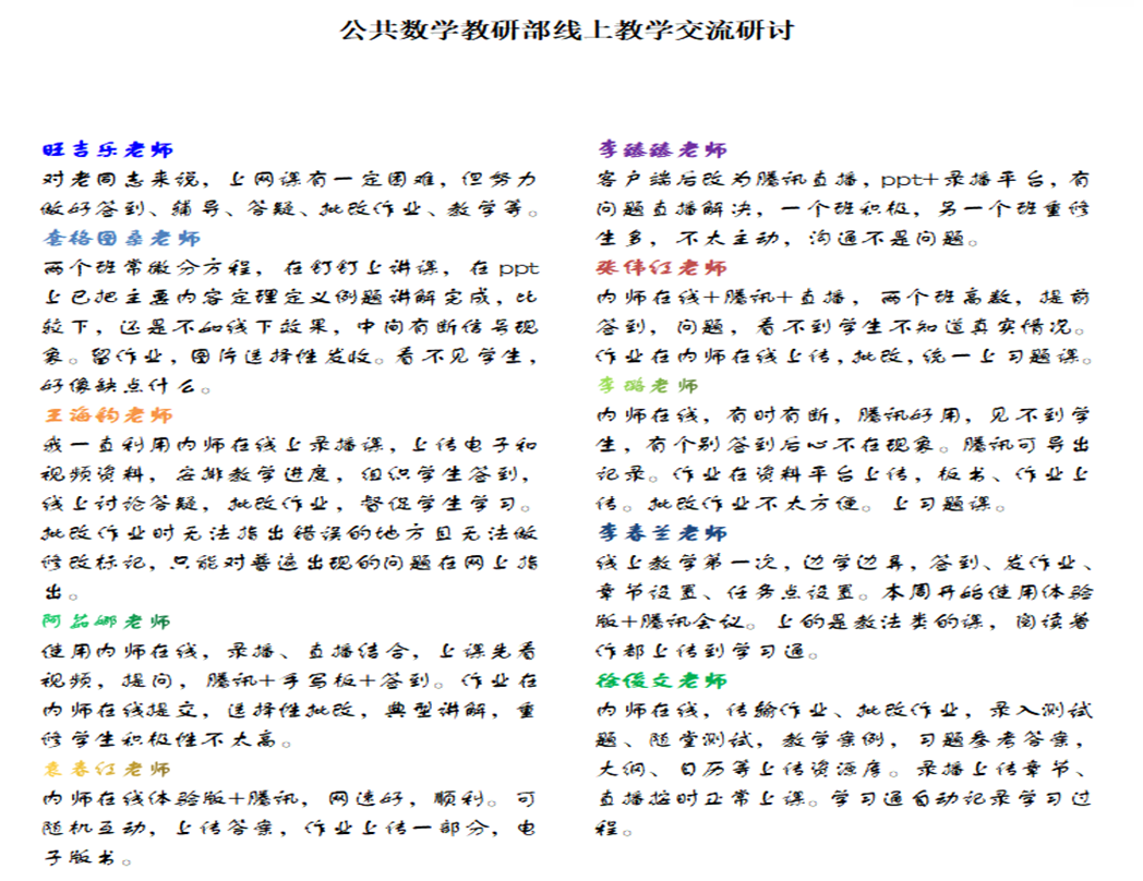 教研过程中,每位老师从思政元素融入课程、线上教学平台的合理使用、线上与线下教学的比较、学生的上课情况等多方面交流分享和现场展示各自线上教学好的经验做法,认真倾听,相互学习,彼此借鉴,达到凝聚智慧、奋力前行的良好效果。