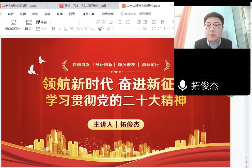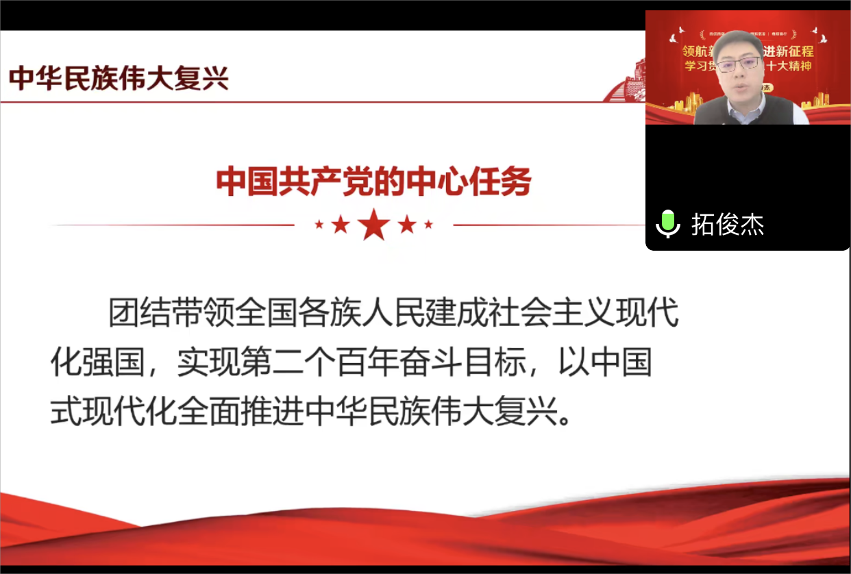 拓俊杰书记围绕深刻把握党的二十大的重要意义、深刻把握过去五年和新时代十年的伟大变革、深刻把握习近平新时代中国特色社会主义思想、深刻把握中国式现代化的中国特色和本质要求、深刻把握全面建设社会主义现代化国家的目标任务以及深刻把握以伟大自我革命引领伟大社会革命的重要要求等方面深入解读了党的二十大精神。拓俊杰书记的宣讲报告内容全面系统、重点突出,引导学员进一步深入领会党的二十大精神实质。必赢242net官网教将继续深入学习贯彻党的二十大精神,确保党的二十大精神在学院落地生根,推动学院实际工作。