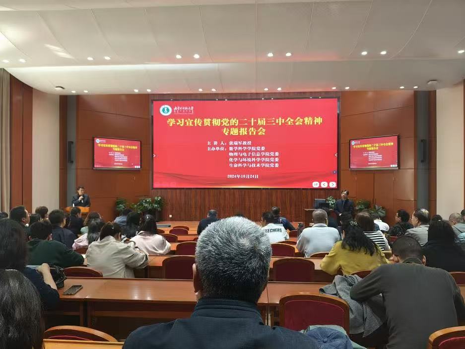 为全面深入学习贯彻党的二十届三中全会精神,深刻领会精神实质,把握核心要义,进一步把全院师生的思想和行动统一到全会精神上来。10月24日下午,必赢官网联合物理与电子信息学院、化学与环境科学学院、生命科学与技术学院在赛罕校区信息楼报告厅共同举办了学习宣传贯彻党的二十届三中全会精神专题报告会,会议邀请马克思主义学院党委书记张瑞军教授作专题宣讲报告,学院党委委员、班子成员,全体教职工参加学习。