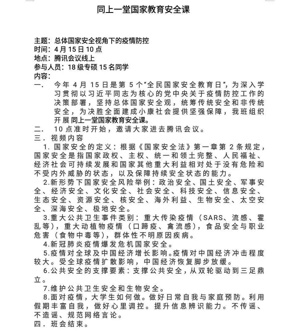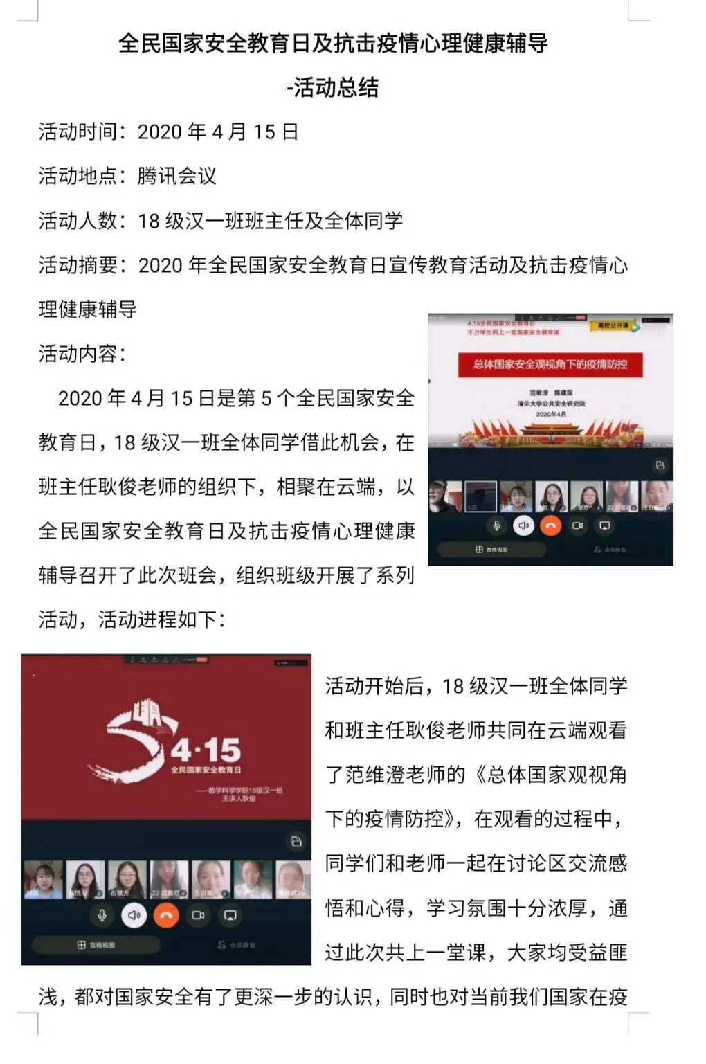 全民国家安全教育日(National Security Education Day)是为了增强全民国家安全意识,维护国家安全而设立的节日。为深入学习贯彻以习近平同志为核心的党中央关于疫情防控工作的决策部署,坚持总体国家安全观,响应国家安全教育,必赢官网各班级围绕“增强国家安全意识”召开主题“云”班会进行学习和交流。