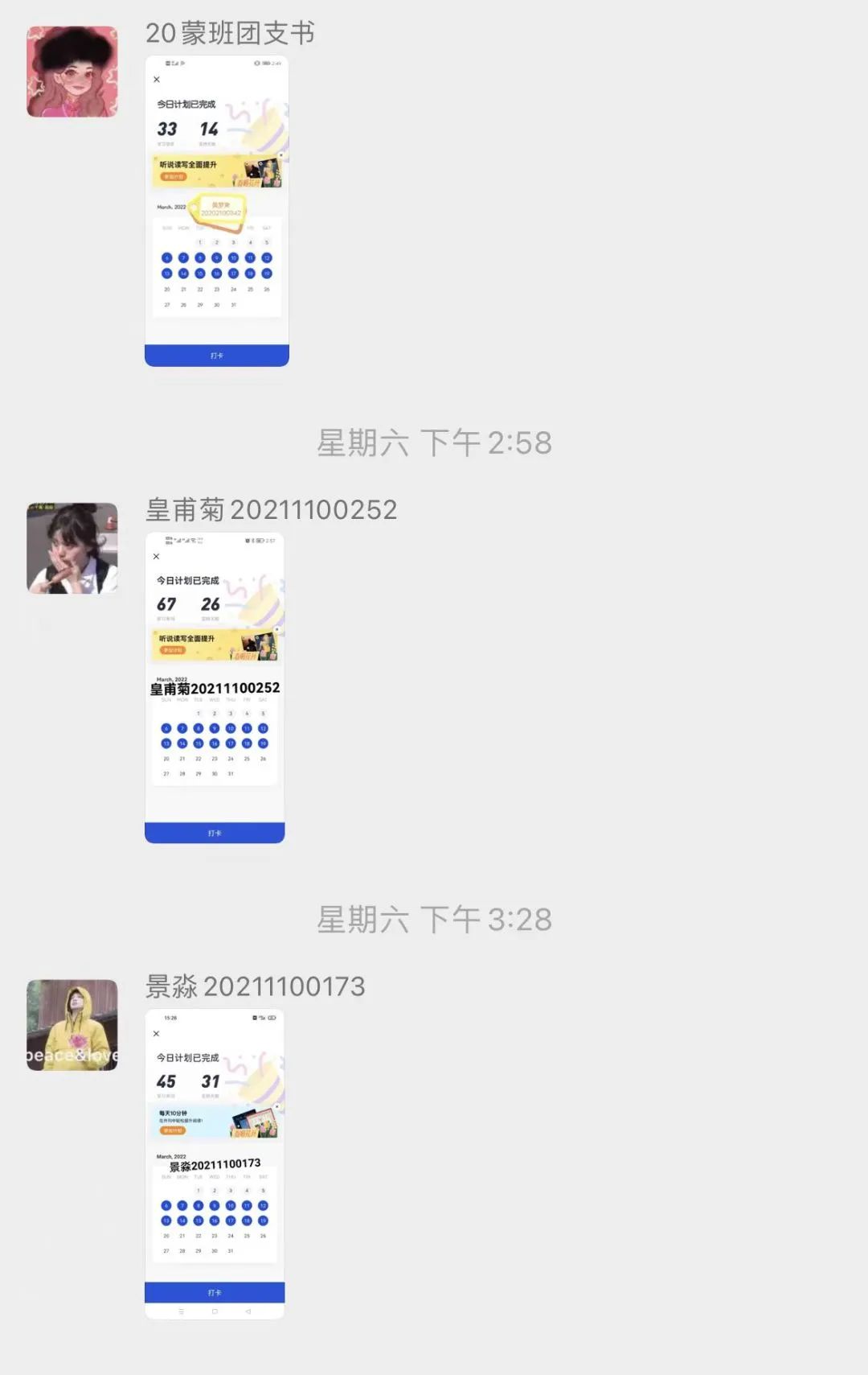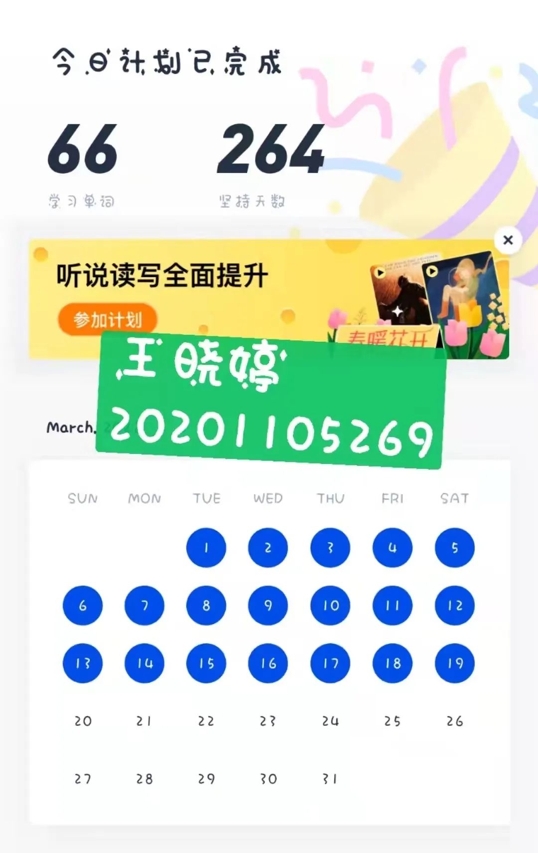 这次的单词打卡活动让同学们提高了学习的自觉性,我们更加愿意积极主动地去学习英语。打卡时候的成就感让我开心不已,我也愿意坚持下去,想看看我能走到多远。一天天的积累学习,也让我们离理想的自己更进一步。不积跬步,无以至千里。让我们一起努力吧!