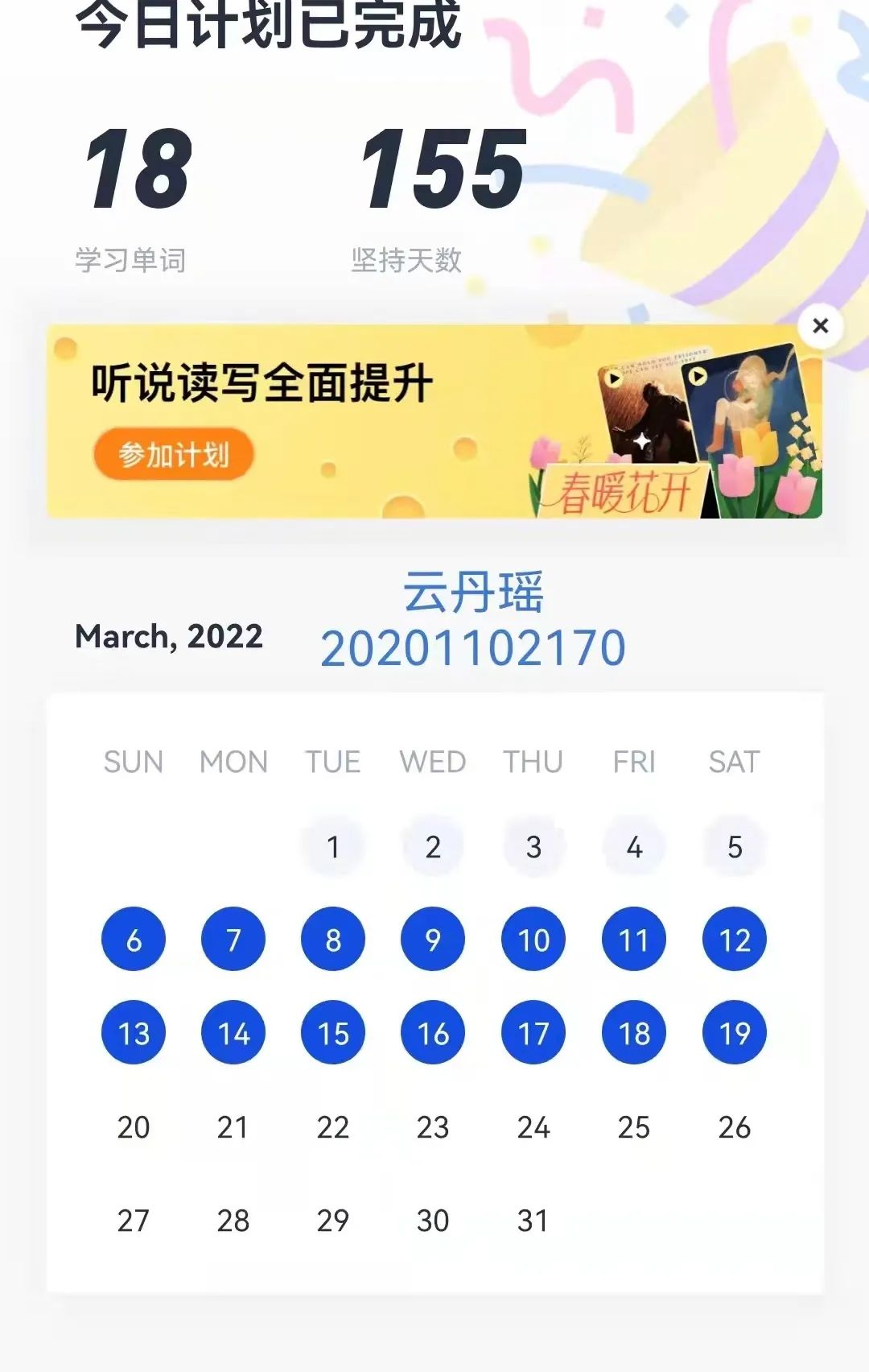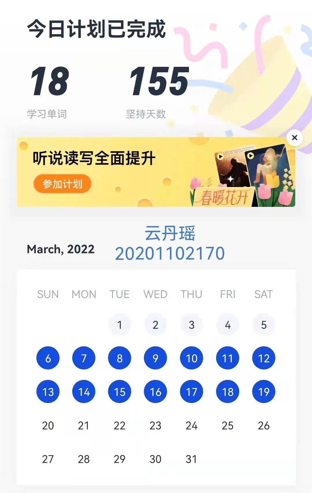 为了丰富学生的居家学习生活,提高学生的学习自觉性,必赢242net官网开展了“学习解疫,提升有我”的英语单词打卡活动,150名学生积极响应活动,进行打卡学习。