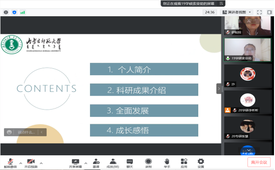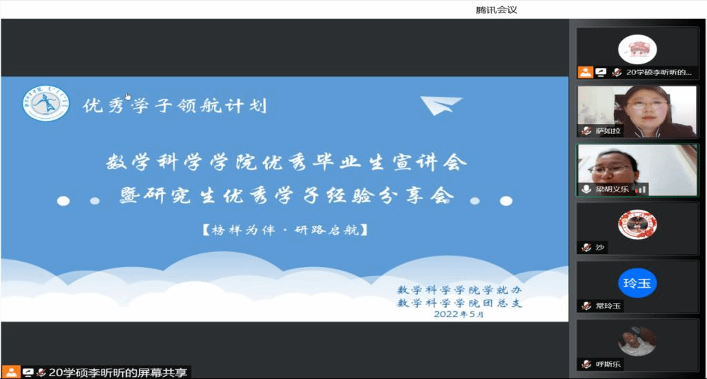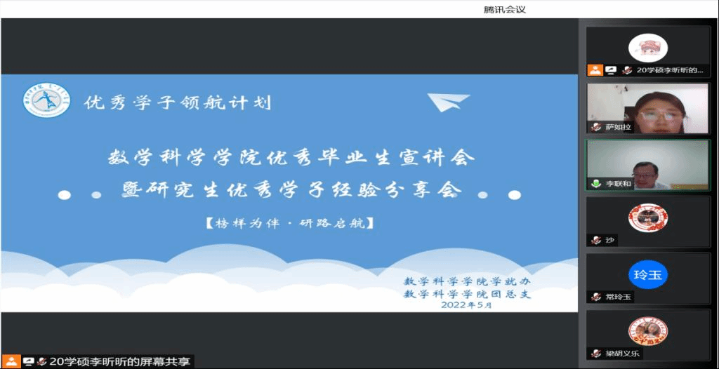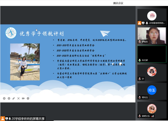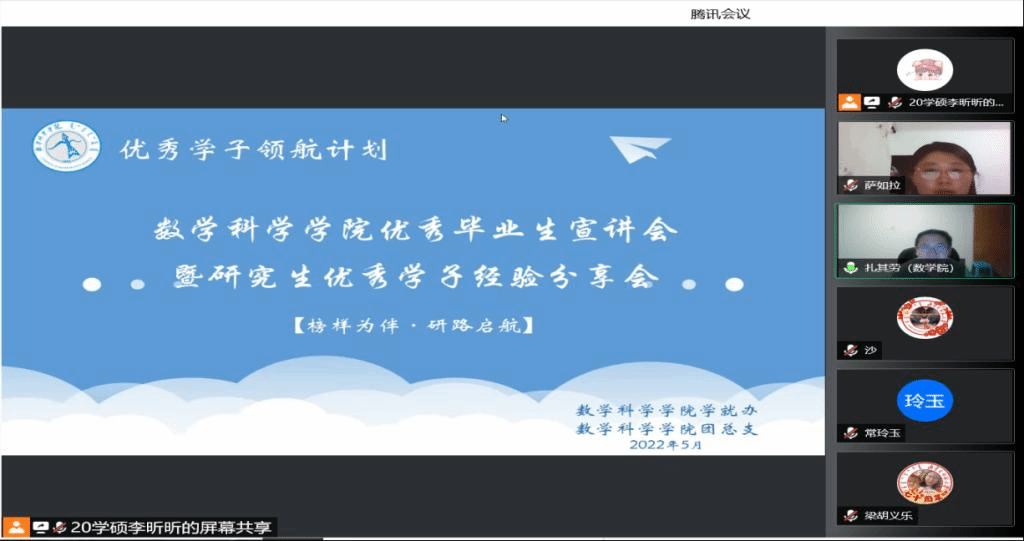 为了充分发挥研究生优秀学子的示范引领作用,更好地落实《必赢242net官网关于开展“榜样为伴·研路启航”研究生国家奖学金获得者事迹宣传活动的通知》《内蒙古自治区教育厅关于报送2022年春季学期研究生教育教学典型案例的通知》《关于组织开展必赢242net官网“学生劳动教育宣传月”活动的通知》等文件要求,必赢官网于5月23日晚,组织全体研究生开展“必赢242net官网优秀毕业生宣讲会暨研究生优秀学子经验分享会”,邀请必赢官网2021年度国家奖学金获得者索亚茹、张慧,2021年度自治区奖学金获得者孙天娇、谭晓漫,2021-2022年度自治区“优秀毕业生”李星然、“三好学生”索亚茹,共5名优秀学子为大家分享自己学习生涯中的经验和感悟。