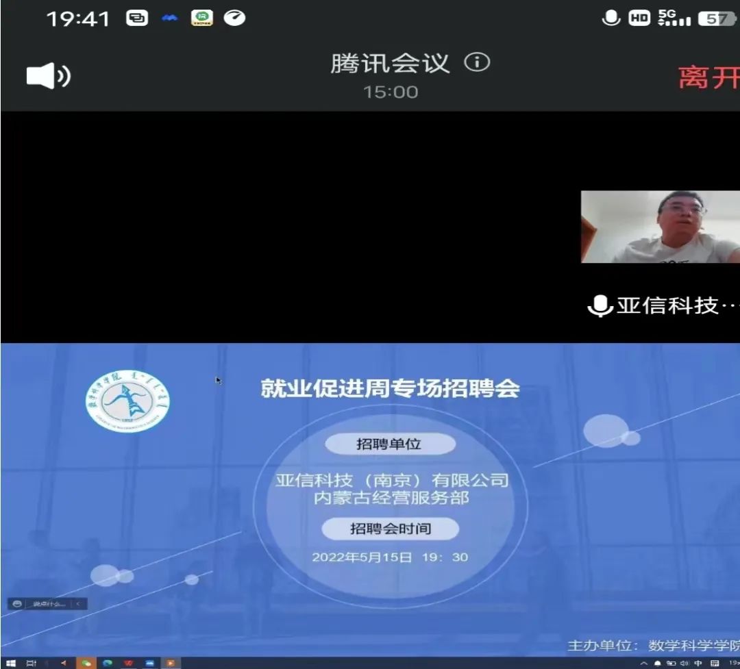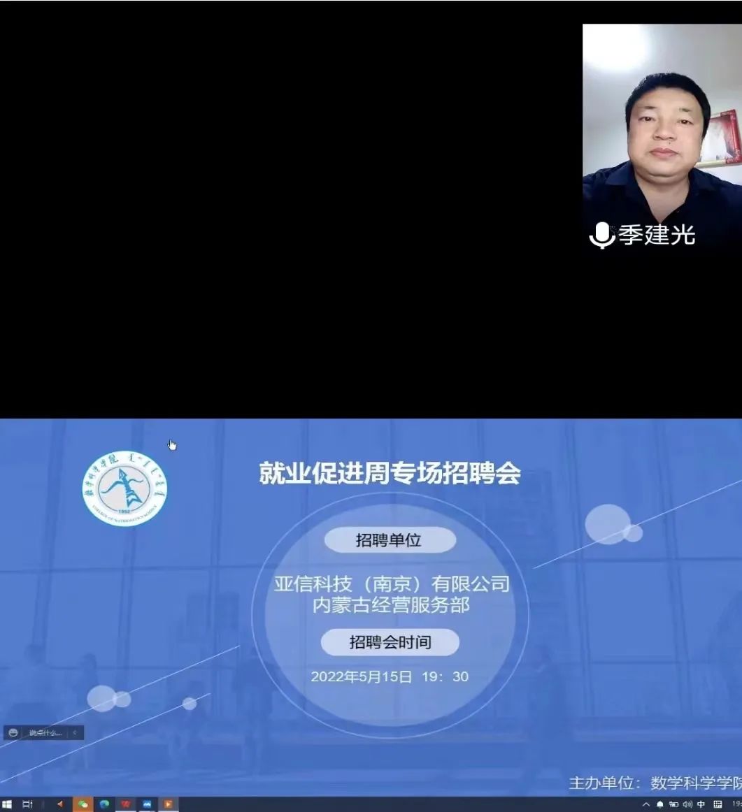 为更好的推进《必赢242net官网2022届毕业生就业促进周系列活动方案》的工作要求,全力促进毕业生尽早就业、顺利择业,5月15日晚,学院针对非师范专业毕业生,邀请亚信科技(南京)有限公司内蒙古经营服务部举办了“就业促进周”网络专场招聘会,学院党委副书记季建光、学生工作与就业办公室副主任刘沙沙、辅导员萨如拉以及亚信科技(南京)有限公司内蒙古经营服务部的负责人参加招聘会议,必赢官网2022届信息与计算科学和统计学专业的50多名毕业生参加本次招聘会。