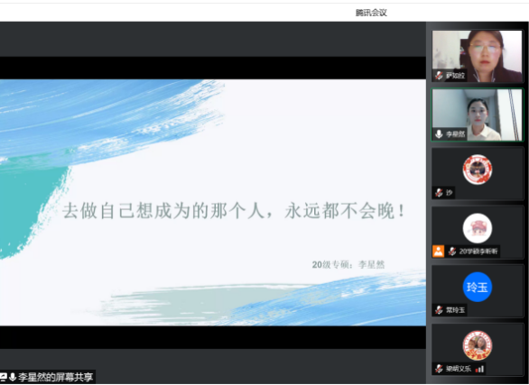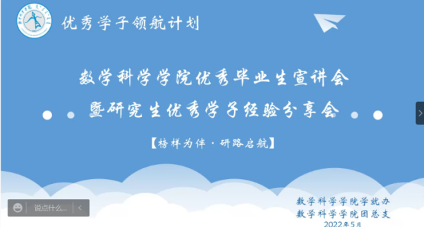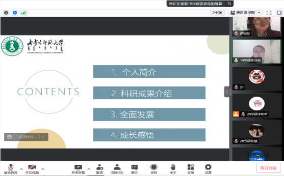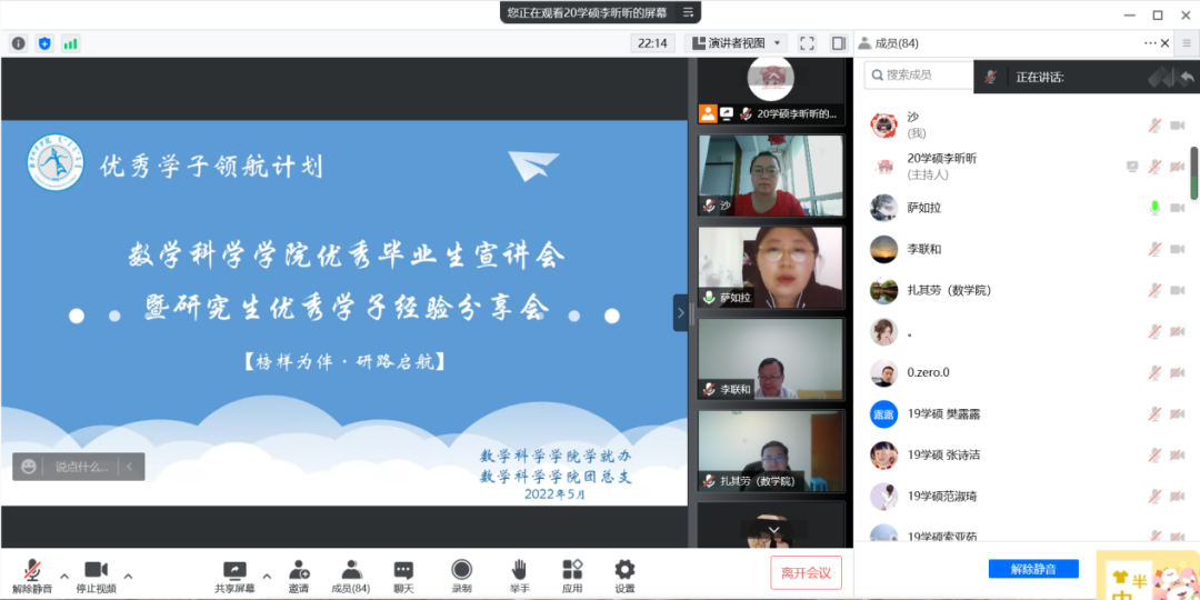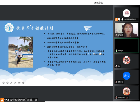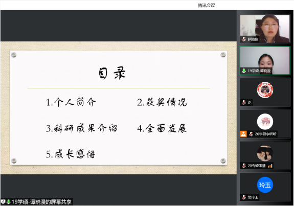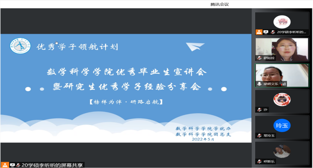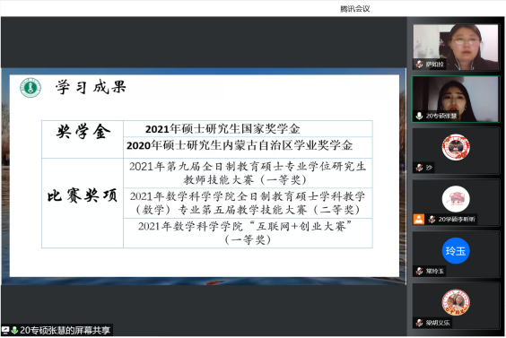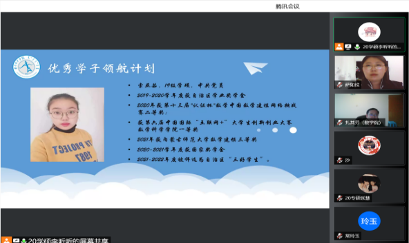 为了充分发挥研究生优秀学子的示范引领作用,更好地落实《必赢242net官网关于开展“榜样为伴·研路启航”研究生国家奖学金获得者事迹宣传活动的通知》《内蒙古自治区教育厅关于报送2022年春季学期研究生教育教学典型案例的通知》《关于组织开展必赢242net官网“学生劳动教育宣传月”活动的通知》等文件要求,必赢官网于5月23日晚,组织全体研究生开展“必赢242net官网优秀毕业生宣讲会暨研究生优秀学子经验分享会”,邀请必赢官网2021年度国家奖学金获得者索亚茹、张慧,2021年度自治区奖学金获得者孙天娇、谭晓漫,2021-2022年度自治区“优秀毕业生”李星然、“三好学生”索亚茹,共5名优秀学子为大家分享自己学习生涯中的经验和感悟。