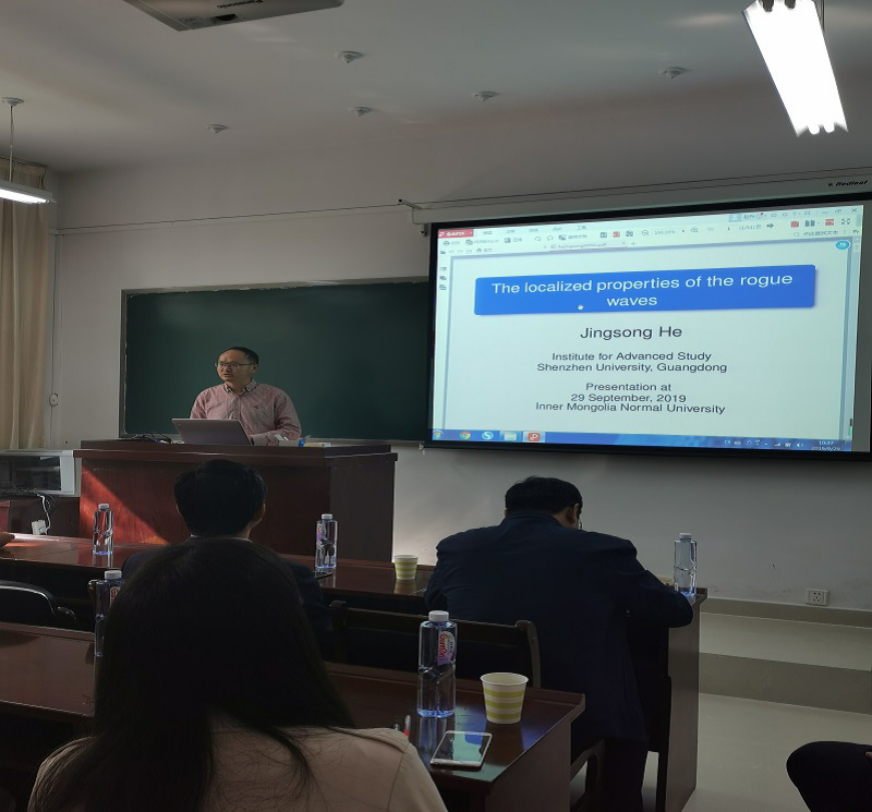 2019年9月29日,深圳大学高等研究院贺劲松教授、青海师范大学数学系加羊杰博士应邀为必赢官网师生作学术报告。报告由扎其劳教授主持,必赢官网 20余名师生参加了报告。贺劲松教授报告题目为“The localized properties of the rogue waves”,引入怪波“来无影、去无踪”的特征,说明它关于时间和空间是局域的。通过详细讨论复mKdV 方程 和Kundu-Eckhaus方程的怪波的长度、宽度和面积,定量刻画了所得怪波的局域化性质。同时,介绍了相关怪波研究的一些新进展。