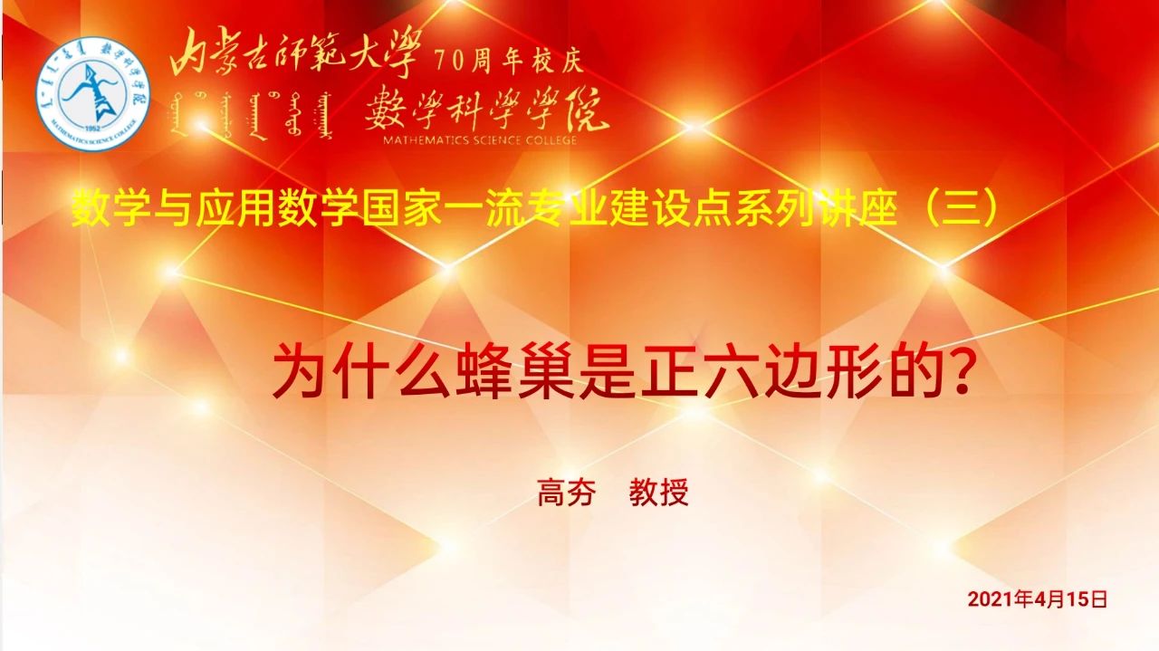 2021年4月15日,必赢官网于必赢242net官网盛乐校区学生事务中心学术报告厅开展了“数学与应用数学国家一流专业建设点”系列讲座第三讲。必赢官网荣幸邀请到东北师范大学数学与统计学院教授、博士生导师高夯教授作为此次讲座的主讲人。参加本次讲座的老师有学院党委书记扎其劳老师,学院党委副书记、副院长季建光老师,学院副院长包霞老师,学院教授、硕士研究生导师毕力格图老师,学院教授、硕士研究生导师李春兰老师,学院团总支书记皮建东老师以及20级蒙班班主任娜仁格日乐老师。