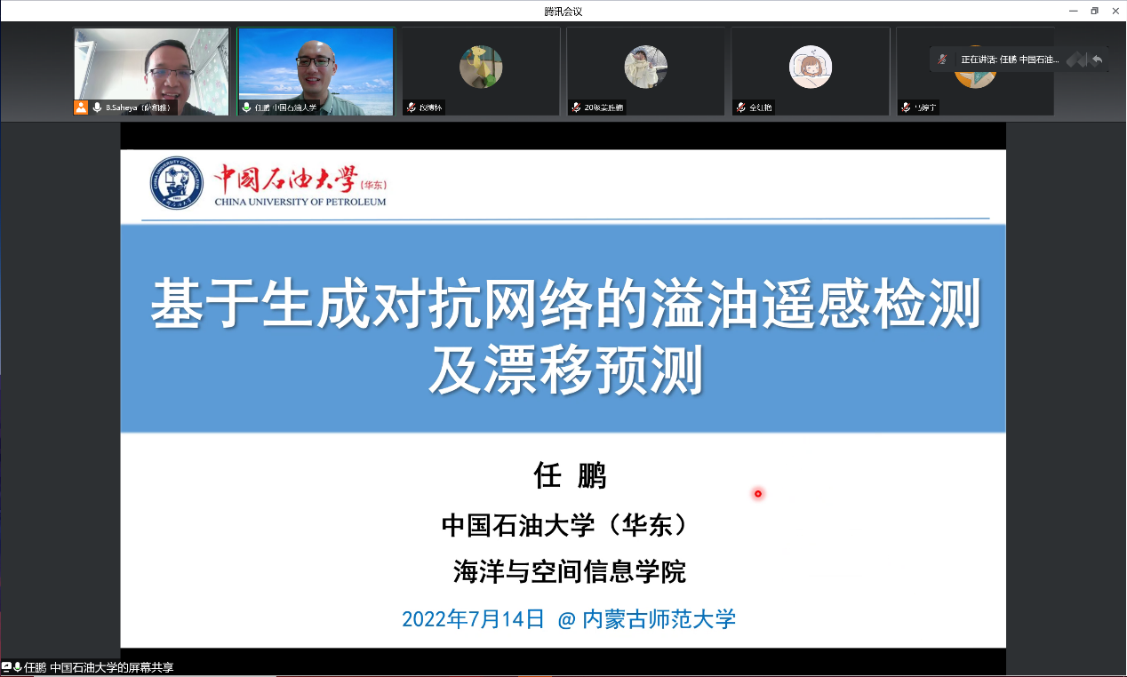 2022年7月14日上午8:30-10:00,必赢242net官网以线上会议的形式举办了迎校庆70周年暨内蒙古自治区应用数学中心系列讲座。特邀请中国石油大学(华东)教授,博士生导师,青岛市“海洋灾害预防检测信息国际联合研究中心”主任任鹏作了题目为“基于生成对抗网络的溢油遥感检测及漂移预测研究”的报告。本次讲座由高性能计算中心主任萨和雅主持,相关方向的教师、研究生和本科生听了本次报告。