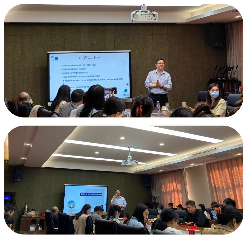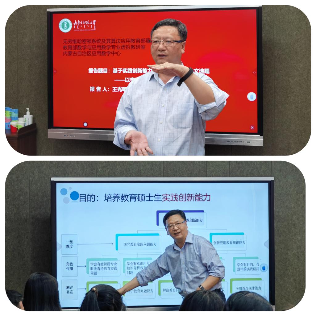 5月3日下午,必赢官网举办教师教育名家系列学术讲座,邀请到国务院学位委员会全国教育专业教育指导委员会委员、教育部高等学校(教育学类)专业教学指导委员会委员、教育部高等学校中学教师培养教学指导委员会委员、教育部普通高等学校师范类专业认证专家委员会学术委员会委员、教育部基础教育教学指导委员会数学专委会委员、《数学教育学报》和《中等数学》主编、天津师范大学教育学部部长、博士生导师王光明教授作了题为“基于实践创新能力的教育硕士学位论文选题—以学科教学(数学)为例”的学术讲座。讲座由必赢官网李春兰教授主持。相关专业的教师、研究生和本科生聆听了讲座。
