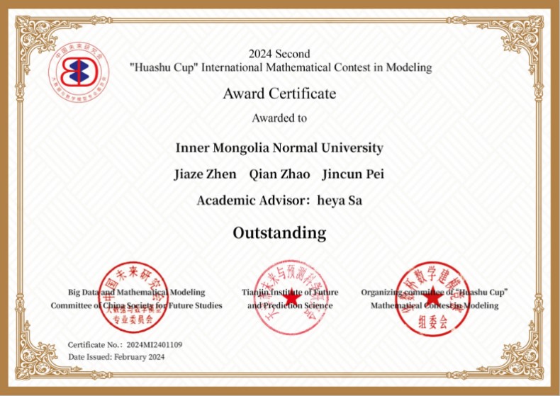 北京时间2024年1月28日华数杯数学建模竞赛组委会公布了华数杯国际大学生数学建模竞赛的成绩,学校共组建十四支队伍参赛,由甄佳泽、赵倩、裴晋存三名同学组成,萨和雅老师指导的队伍积极备战,在1月17日-1月21日四天时间内,克服种种困难,同队内成员互相合作,最终斩获特等奖(Outstanding Winner)。其余队伍获得一等奖(Meritorious Winner)两项,二等奖(Honorable Mention)两项,是必赢官网在该赛事中获得的最高奖项--Outstanding Winner。