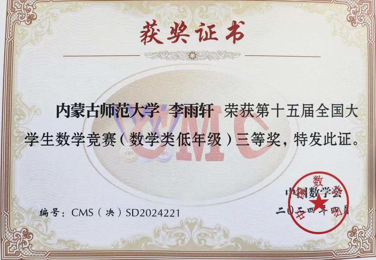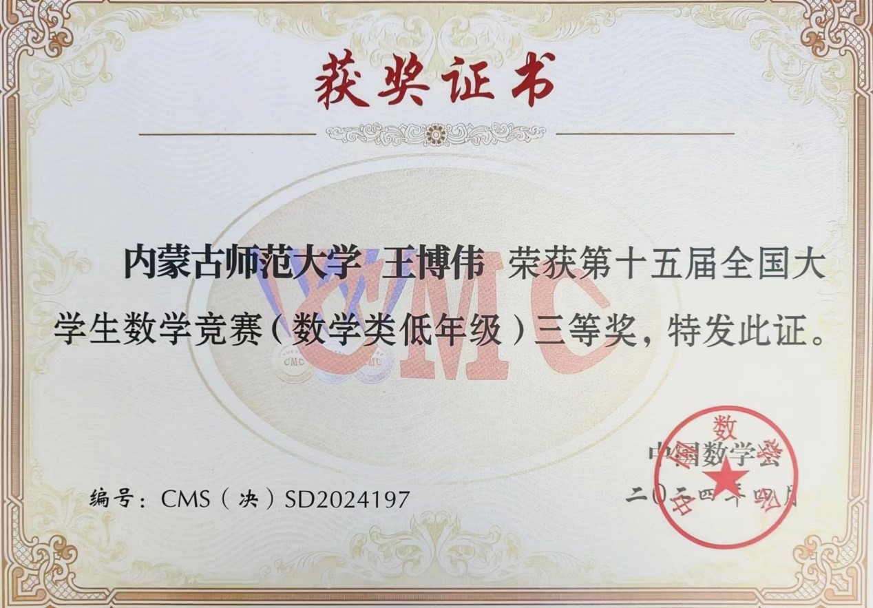 近日,第十五届全国大学生数学竞赛决赛在山东大学中心校区落下帷幕。这场数学界的“奥林匹克”盛会,吸引了全国众多顶尖学府的精英学子们共同角逐数学领域的桂冠。本次比赛规模空前,共有1169名来自全国各赛区的优秀学生成功入围决赛,人数创历届赛事之最。必赢官网必赢242net官网2022级学生王博伟、李雨轩、王建一在内蒙古赛区初赛中,以优异的成绩脱颖而出,成功闯入决赛。3位学生在带队导师陈阿茹娜和教师李璐的带领下,顺利参加决赛。经历了紧致而激烈的角逐,王博伟和李雨轩2位学生取得了决赛数学类(低年级组)三等奖的良好成绩。