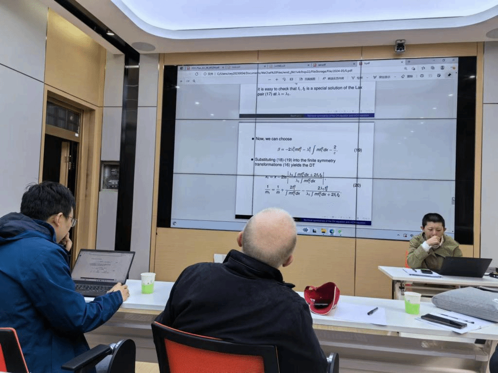Pavlov教授在报告中首先构造了二阶ODE的一般解,然后引入特征参数,构造了KdV方程和耦合KdV方程的多相位解。李年华教授基于Reciprocal变换构造了Camassa-Holm类型方程的Darboux变换及多孤子解。