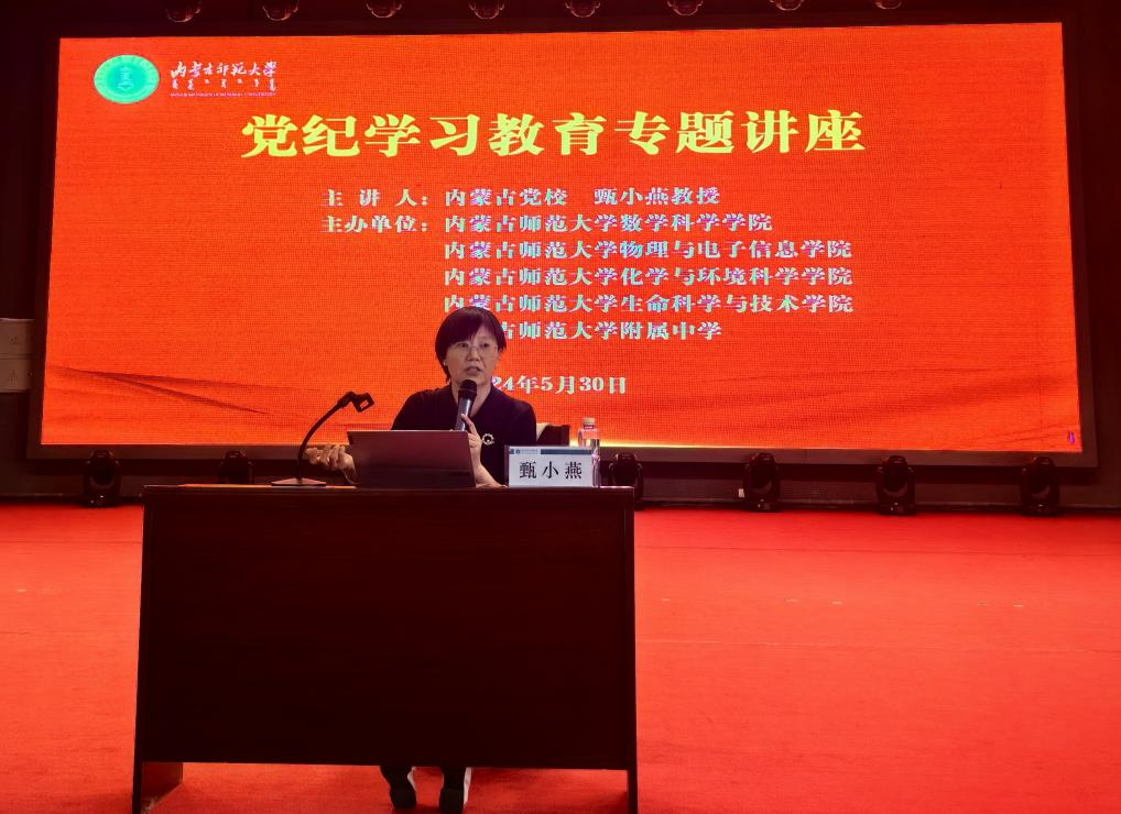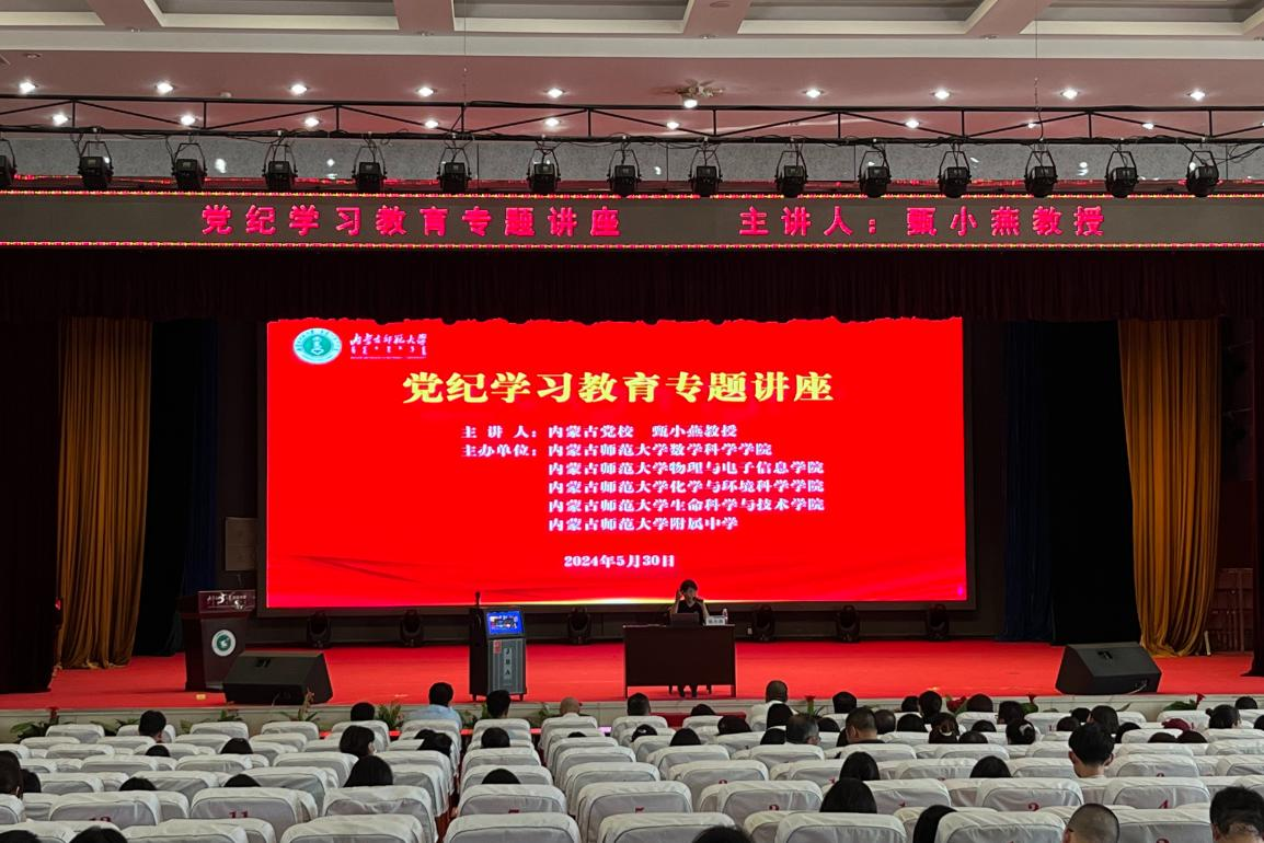 为深入学习贯彻习近平总书记关于全面加强党的纪律建设的重要论述和关于党纪学习教育的重要讲话重要指示精神,认真学习领会新修订的《中国共产党纪律处分条例》,进一步加强必赢官网师生党员的党性修养与政治素质,5月30日下午,必赢官网联合物理与电子信息学院、化学与环境科学学院、生命科学与技术学院和附属中学在附属中学共同举办了党纪学习教育专题讲座。讲座特邀内蒙古党校党史党建教研部甄小燕教授作题为“深入学习贯彻《中国共产党纪律处分条例》”的专题辅导报告,学院全体教工党员和部分学生党员参加学习。