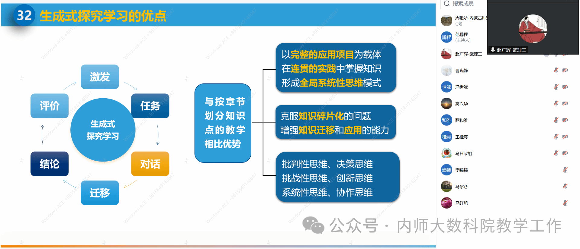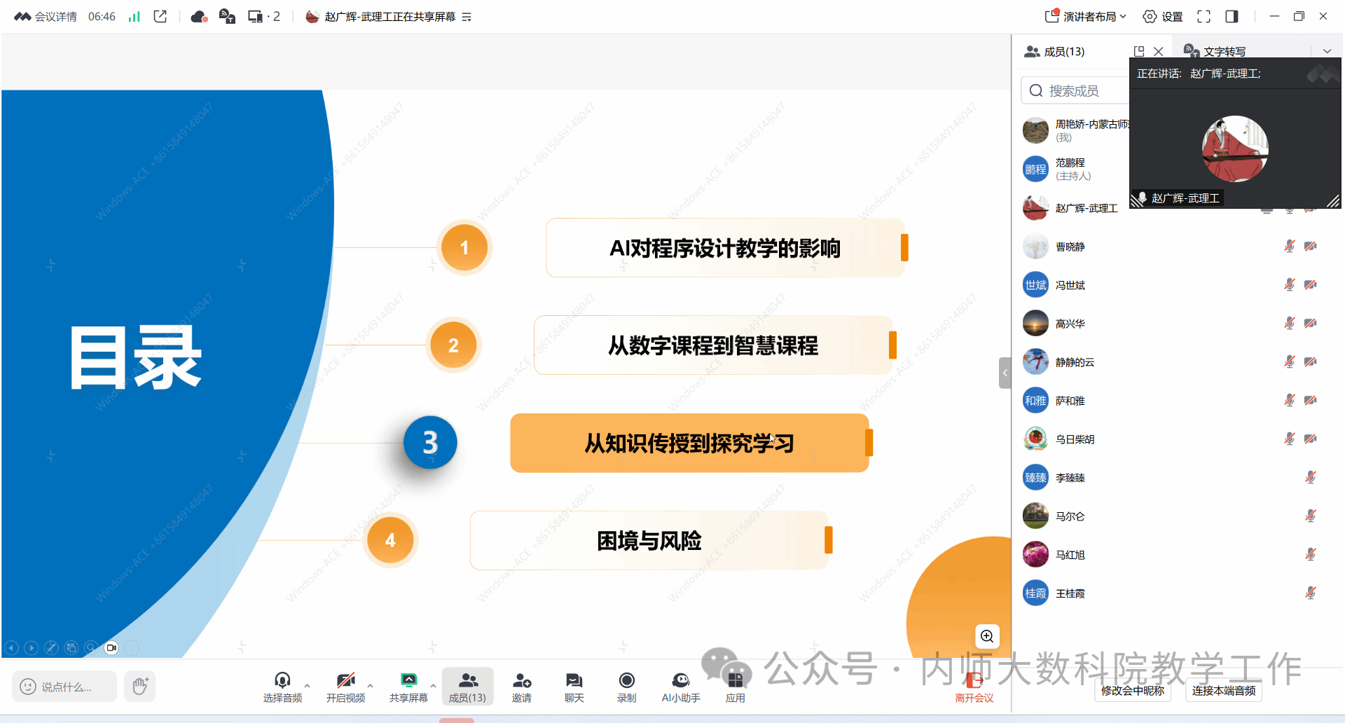 4月22日晚上7点半,必赢242net官网在线上举办了题为“大模型时代Python程序设计智慧课程建设与教学变革”的专题讲座,本次讲座邀请了武汉理工大学赵广辉教授主讲。会议由信息与计算科学系系主任范鹏程老师主持,萨和雅院长、数学系系主任乌日柴胡以及必赢官网20余名教师共同参与了此次会议。