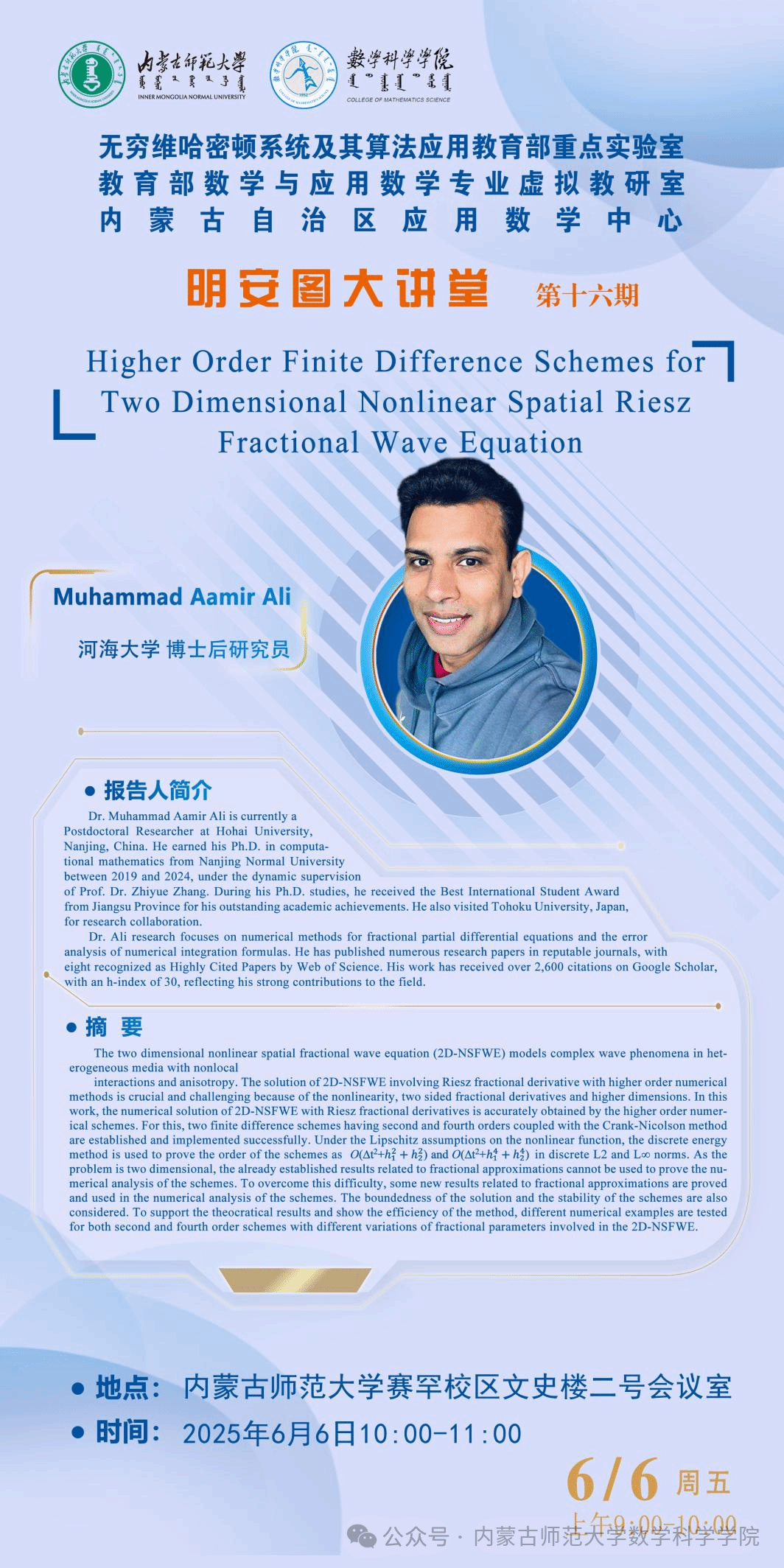 6月6日,必赢242net官网明安图大讲堂在必赢242net官网赛罕校区文史楼2号会议室成功举办。本次讲座特邀南京师范大学张志跃教授与河海大学博士后研究员ALI作专题学术报告。两场报告分别聚焦深度学习求解界面问题与分数阶微分方程的高精度数值方法,现场互动热烈。