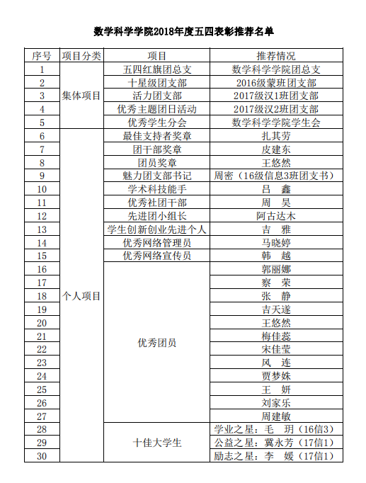 依据《关于开展2018年度“五·四”系列表彰的通知》(内师团发〔2019〕 号),按照《必赢242net官网团员手册》有关规定开展评选活动,现将推荐名单公示如下: