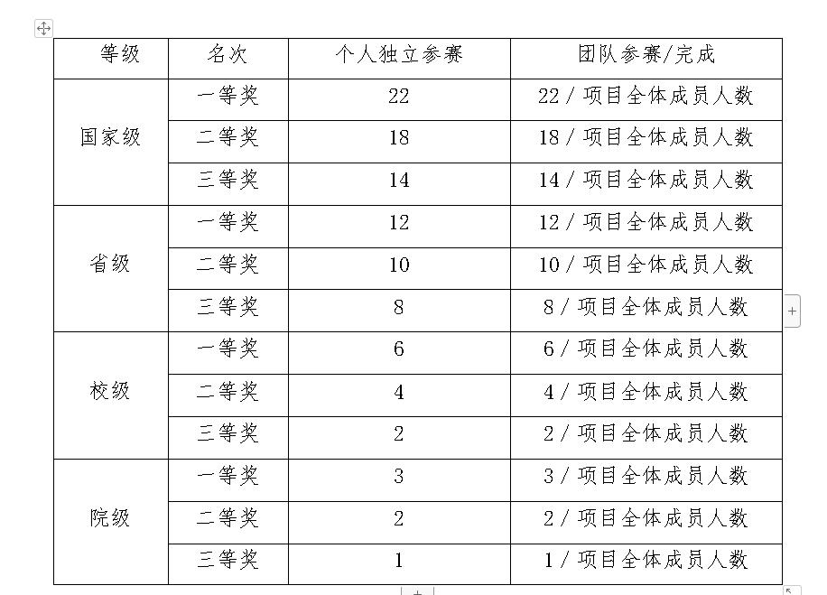 说明:①学生积极参加学院及以上级别的各类竞赛活动可以加分, 每次加 0.4 分,如:体育、文艺、演讲、征文、知识竞赛、数学建模、教师技能大赛等;②获得优秀奖、鼓励奖或参加省级以上比赛未取得名次者,按照下一个等级奖项的三等奖加分。如获得国家级优秀奖的,按照省级三等奖加分,以此类推;③获得院级优秀奖加 0.5(个人)、0.2