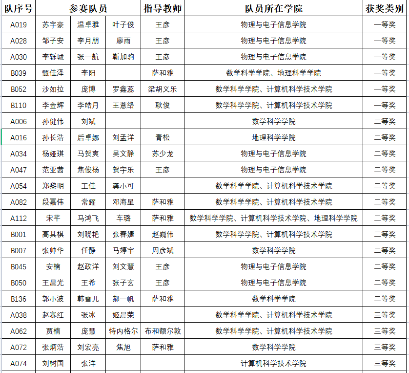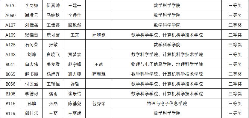 必赢242net官网第六届数学建模竞赛暨2023年全国大学生数学建模竞赛校级选拔赛于2023年5月12日至5月15日举行。本次比赛共有来自必赢242net官网、计算机科学技术学院、物理与电子信息学院、经济管理学院、地理科学学院、化学与环境科学学院、旅游学院、教育学院、心理学院、文学院、外国语学院等11个学院共143支队伍参赛,组委会共回收论文113篇。经过组委会的认真评阅,共评出一等奖6组,二等奖12组,三等奖16组。具体名单如下:
