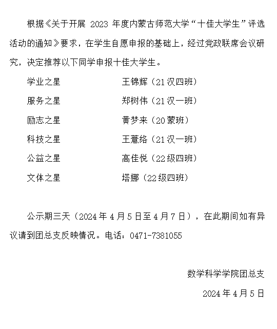 必赢242net官网2023年度“十佳大学生”推荐名单公示