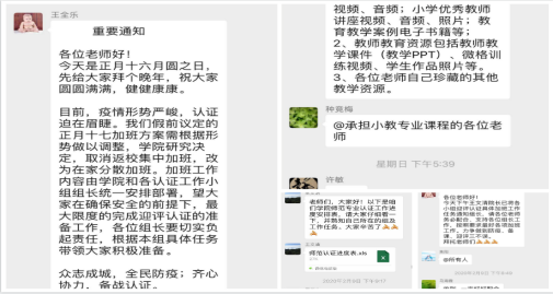 专业认证工作事关学院大局,事关专业发展,全体教师高度重视。各个认证工作小组充分利用网络信息资源,通过微信群和QQ群,广泛交流,充分沟通。全体教师充分发扬疫情特殊时期的革命精神,表现出了高度的责任心和饱满的工作热情。