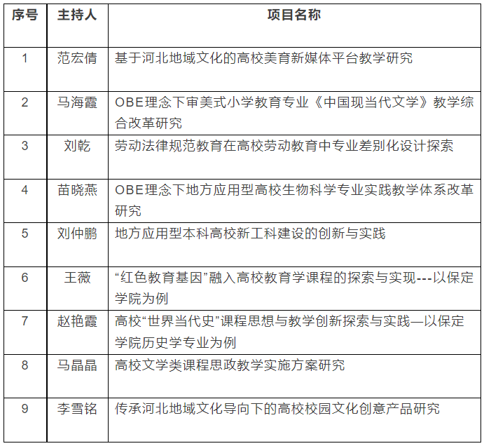 根据《河北省教育厅关于下达2021-2022年度河北省高等教育教学改革研究与实践项目的通知》(教高[2022] 21号),新葡官网共有9项科学研究项目获得立项,其中新葡官网马海霞老师申报的《OBE理念下审美式小学教育专业<中国现当代文学>教学综合改革研究》、王薇老师申报的《“红色教育基因”融入高校教育学课程的探索与实现——以新葡8883官网AMG官网为例》获批。