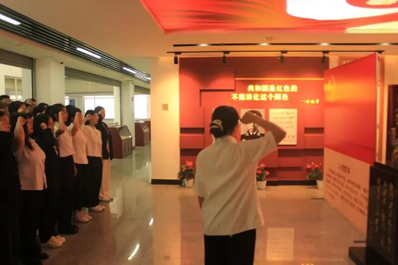 参观结束后,全体党员整齐列队,面向鲜红的中国共产党党旗,庄严地举起右拳,重温入党誓词。