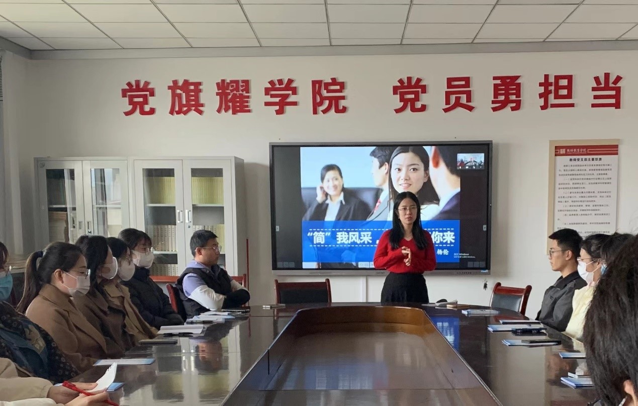 活动开始,杨伦老师提醒同学们正视当下的形势,做好求职准备,树立正确的就业观、择业观,在求职过程中放平心态,充分挖掘个人优缺点,利用个人优势介绍自己、宣传自己。她从搜集招聘信息、了解目标岗位招聘条件、材料准备三方面介绍了求职前应做准备,并结合小学教育专业学生特点,重点强调了了简历制作和自我介绍的技巧。