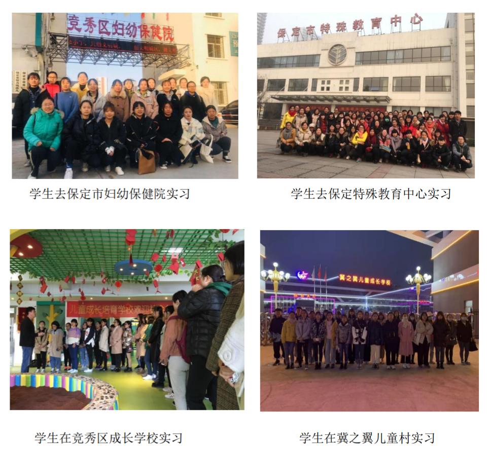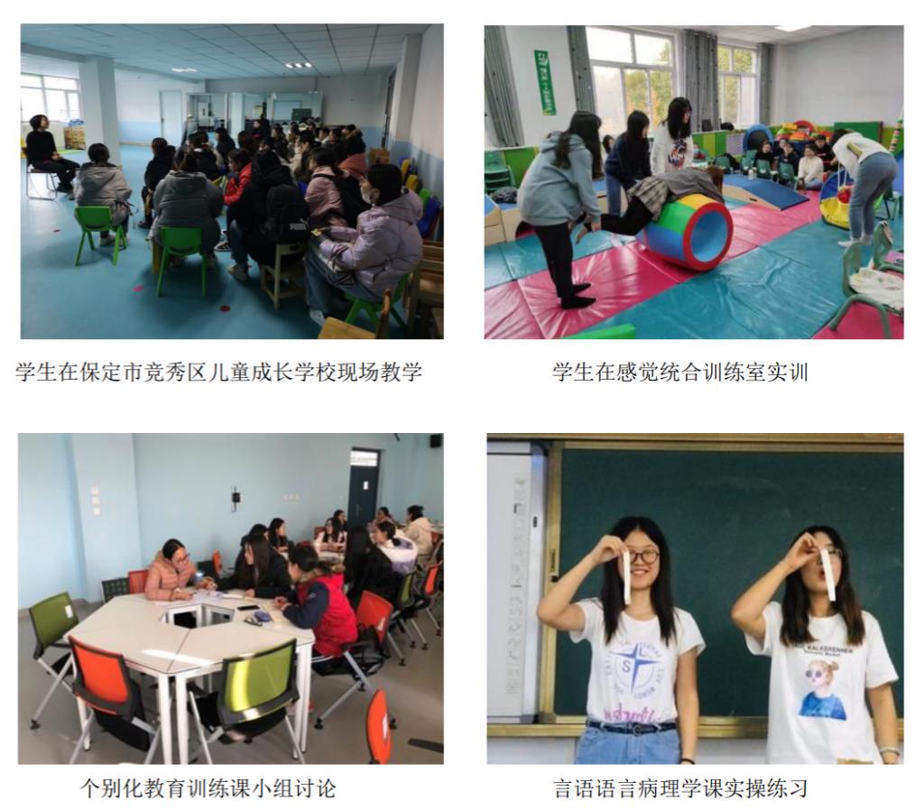 特殊教育专业自开办以来,在课程设置、实践教学等方面始终贯彻紧密联系行业一线工作实际的办学原则。充分利用校外实践教学基地,包括北京市朝阳区爱心雨润智力残疾人康复服务中心、北京昌雨春童康复中心、保定市特殊教育中心、保定市竞秀区妇幼保健院、保定市竞秀区儿童成长学校、天津市曦语语训中心、三河市同助一康复中心、保定市冀之翼儿童村等实习基地等,增加学习和实践的结合度,提升学生的实际工作能力。