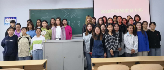实习实训教研室负责人邵巧云主任从实习工作的具体任务出发,详细地为同学们梳理了实习期间需要完成的具体工作,并提醒按时完成各项实习任务。并组织18特教专科的全体同学在讲台前合影留念。