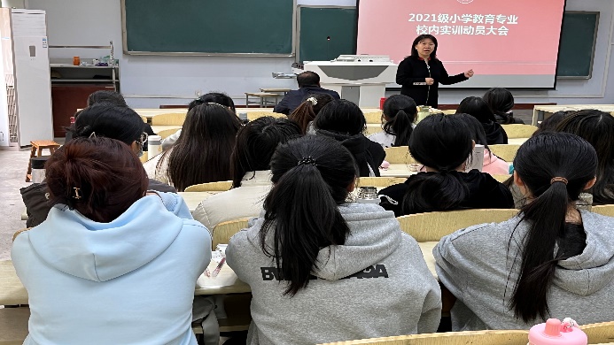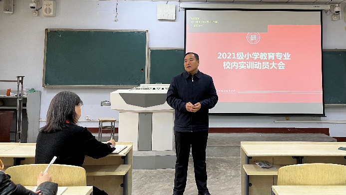 学校高度重视我专业校内实训工作,学校教务处、实验实训中心给予了大力的支持。424日上午,教务处副处长王树林为21级师范生进行了动员大会,他强调:实训是优秀教师成长的必经之路,鼓励师范生赓续二师百年优良传统,要好好学、好好练、好好看。新葡8883官网AMG官网副院长种竟梅就开展实训工作的重要性和必要性进行了强调,鼓励师范生练好、学好,强化三字一话能力、提高简笔画技能、扎实基本功。实验实训中心王鹏老师详细介绍了微格教室的使用技巧,提高师范生信息素养。