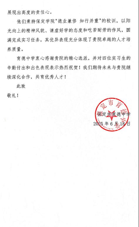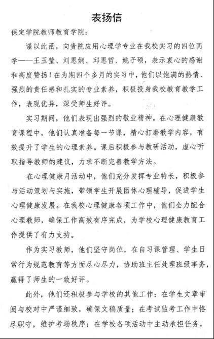 近日,新葡8883官网AMG官网收到2022级应用心理学专业四位同学——王玉莹、刘思娴、邱思哲、姚子硕所在实习单位保定市育德中学的表扬信。信中高度评价了四位同学在2025年春季学期实习期间展现出的强烈敬业精神、扎实专业功底和认真负责的工作态度。