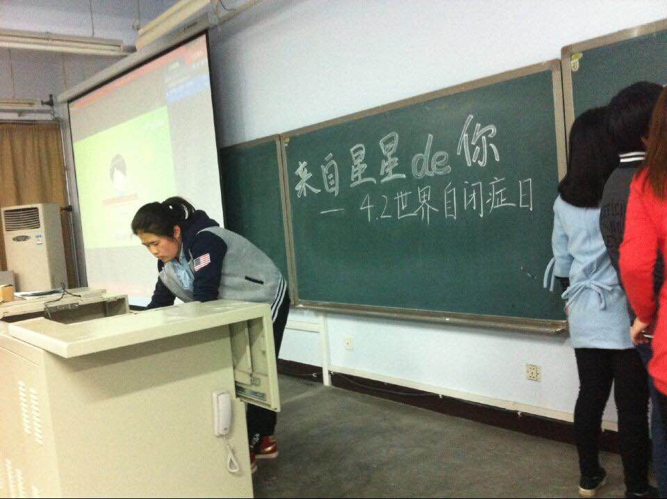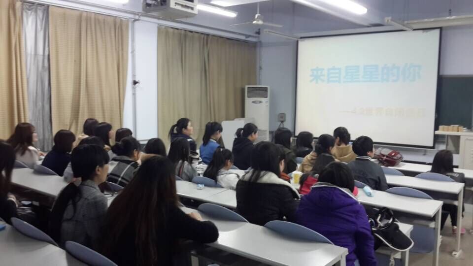 2015年4月2日特殊教育专业于19点在B楼311教室举行了关于关爱自闭症的一系列活动。今年的4月2日是第八届世界自闭症日,今年联合国大会决议将自闭症日主题定为:“职业:自闭症优势”。我们紧紧围绕这一主题,展开了一系列的活动,前期的宣传、展板的制作和最终的实施电影的放映与老师进行讲座形式的普及知识都是希望通过我们的努力来呼吁社会理解、关注、关爱自闭症,让自闭症患者不再受社会现实的冷漠、无视,甚至是排除。“让世界亮起来”,不只是一句口号,而是包含对自闭症患儿的理解和关爱。希望越来越多的人尊重他们,了解他们,关爱他们。