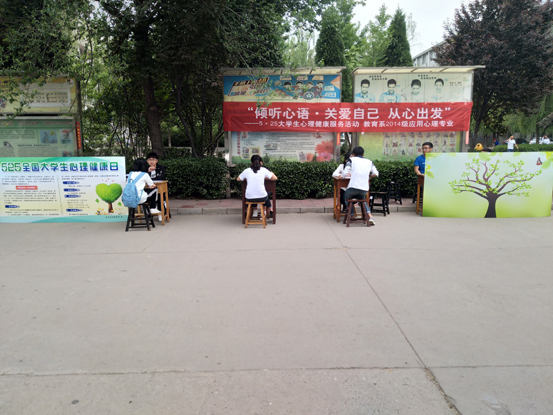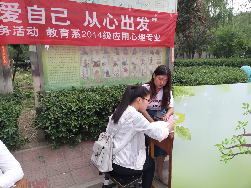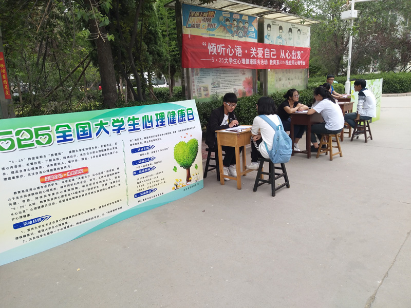 教育系应用心理专业的学生,本着发扬“关爱自己 从心出发”的宗旨,致力于关注全校学生的心理状态,倾听同学在生活、学习、工作中遇到的种种问题,帮助、陪伴同学度过心理瓶颈期,做全校同学的知心人。值此“5·25”之际,教育系应用心理专业14级本科一班的学生,开展“关爱自己 从心出发”心理健康月活动,希望借此帮助全校同学树立良好的心理意识,维护心理健康。