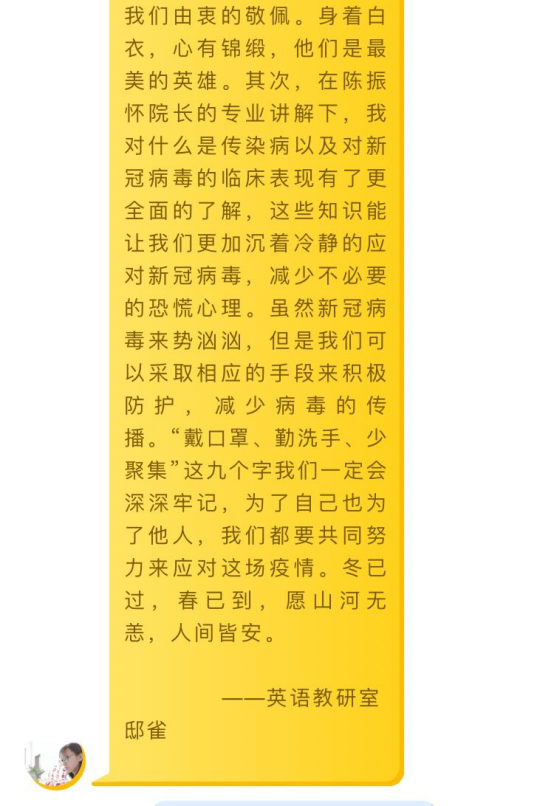 2020年4月15日下午15:00,特邀保定市人民医院陈振怀院长作“校园如何防控新冠肺炎”专题知识讲座,萤火小学总校接到通知后,立即通知五所分校,要求各分校组织全体教师积极按时收看直播。