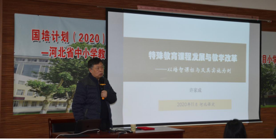 2020年11月30日下午,特殊教育在校部分学生利用课余时间,聆听了由新葡官网承办的“国培计划2020”——河北省特教学校教师培训项目中北京联合大学许家成教授讲授的《特殊教育课程发展与教学改革》专题讲座。