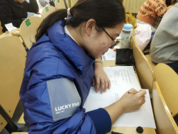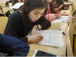 随后是硬笔字考核。统一发放书法纸,限时30分钟,书写内容为《陋室铭》。短短的30分钟同学们都认真执笔书写,静寂的只能听见纸和笔摩擦发出的声音。考核结束后,评委老师与同学们交流书写技巧,给予耐心指导。