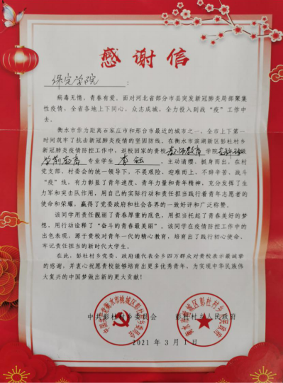 在谈到战”疫”一线工作时,她语气坚定地说“投入到这份工作中身上肩负的并不只是工作本身,更重要的是村民的安全,我的这份付出是值得的。虽然不能像医护人员一样奔赴在最前线,但我很高兴可以为抗击疫情出一份力。返校后,只要学校有需要,我还会毫不犹豫地参加志愿服务,为打赢这场疫情防控阻击战贡献自己的力量。”李钰同学的优秀表现,贏得了当地政府的充分肯定和赞誉。