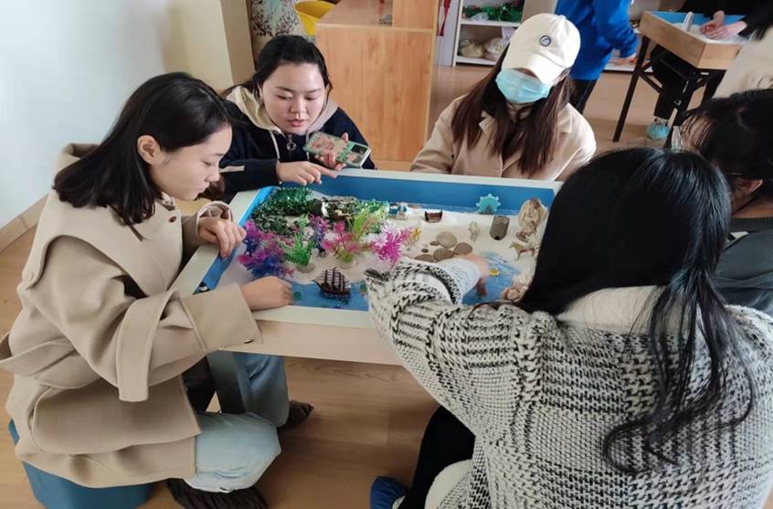 我们还进行了团体箱庭和朋辈辅导,我们围绕沙盘进行选择的过程,很像我们每天的日常生活,忙碌而充满了各种诱惑,将我们的心意搅动得蠢蠢欲动,如同水中泛起的泥沙,所以,如果经常自我觉察,觉察的目光就像阳光照射进水底,让我们看到了自己的各种想法、欲望、思绪等等,并开始自问、溯源,我们的眼睛看向内在时,外面大千世界对我们的干扰便自然削弱了,这个过程中便发现了不一样的世界,激发了自我探索的好奇心,目光投射进来的这个过程仿佛就是一个净化水质的过程,让那些泛起的沙子慢慢沉落到水底,让水变得清澈了。