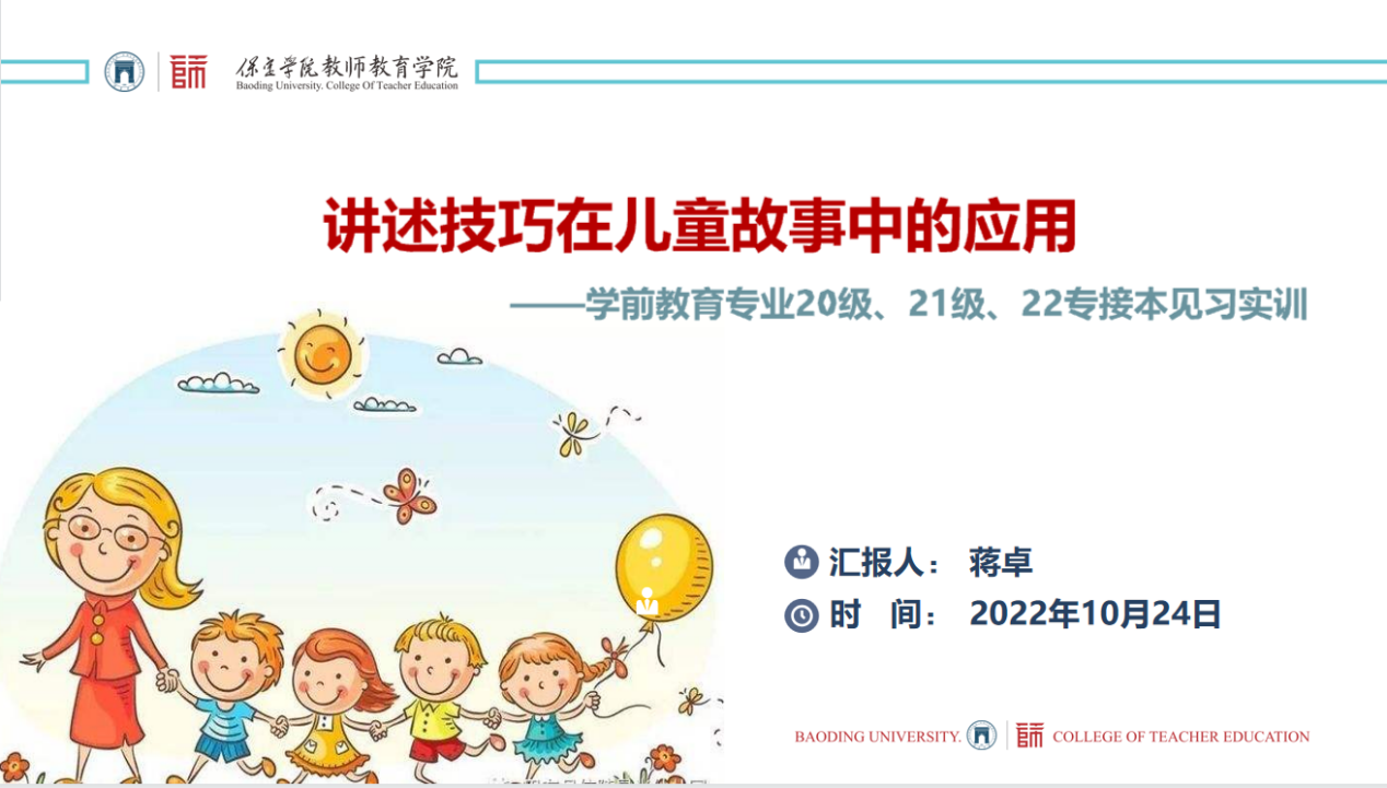 2022年10月24日上午,新葡8883官网AMG官网学前教育专业2020级、2021级和2022级专接本全体同学通过线上与线下相结合的方式,进行了第一场校内见习实训活动——《讲述技巧在儿童故事中的应用》的专题讲座。