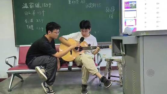 随着班级氛围不断升温,一曲《夜空中最亮的星》在柔和明亮的吉他声中悠悠回荡在同学们耳畔,励志的歌词在深沉的声音中激励着同学们在大学四年中勇于作为,一首《哗啦啦少年再见》轻快的节奏书写着少年心事,展现出青春的磅礴力量。