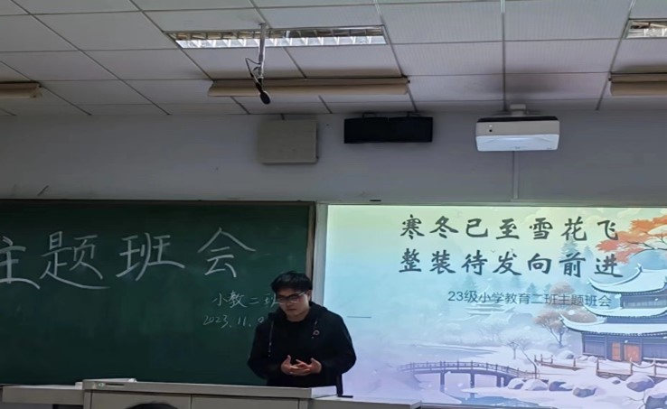为了增强班级凝聚力,促进班级建设,2023年11月11日晚,2023级小学教育二班于G-127教室召开了“寒冬已至雪花飞,整装待发向前进”主题班会。本次班会由班主任杨伦老师和班级全体同学共同参会,班长高瑞申主持班会。