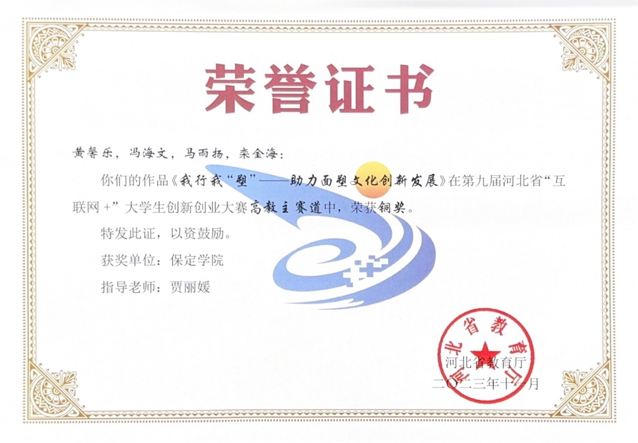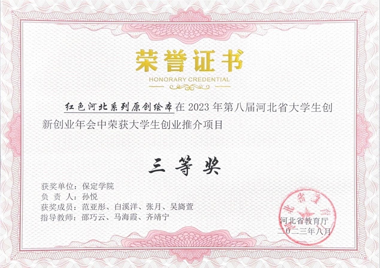 新葡8883官网AMG官网2021级黄馨乐、冯海文、马雨扬、栾金海同学的项目《我行我“塑”——助力面塑文化创新发展》在第九届河北省“互联网+”大学生创新创业大赛中获铜奖。2021级孙悦、范亚彤、白溪洋、张月、吴旖萱同学的项目《红色河北系列原创绘本》在第八届河北省大学生创新创业年会中获三等奖。