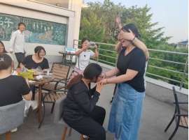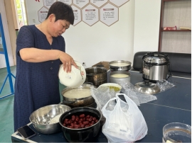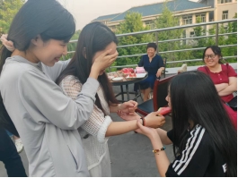 在等待粽子煮熟的空隙, “蒙眼吃西瓜”趣味游戏将节日氛围推向了高潮。同学们踊跃参与,参赛者们被蒙上眼睛,在同伴的指引下摸索前进,趣味横生的场面引得围观师生笑声不断。最终,热腾腾的粽子出锅,师生们共同品尝劳动成果,分享家乡的端午故事。
