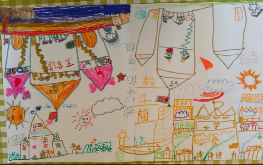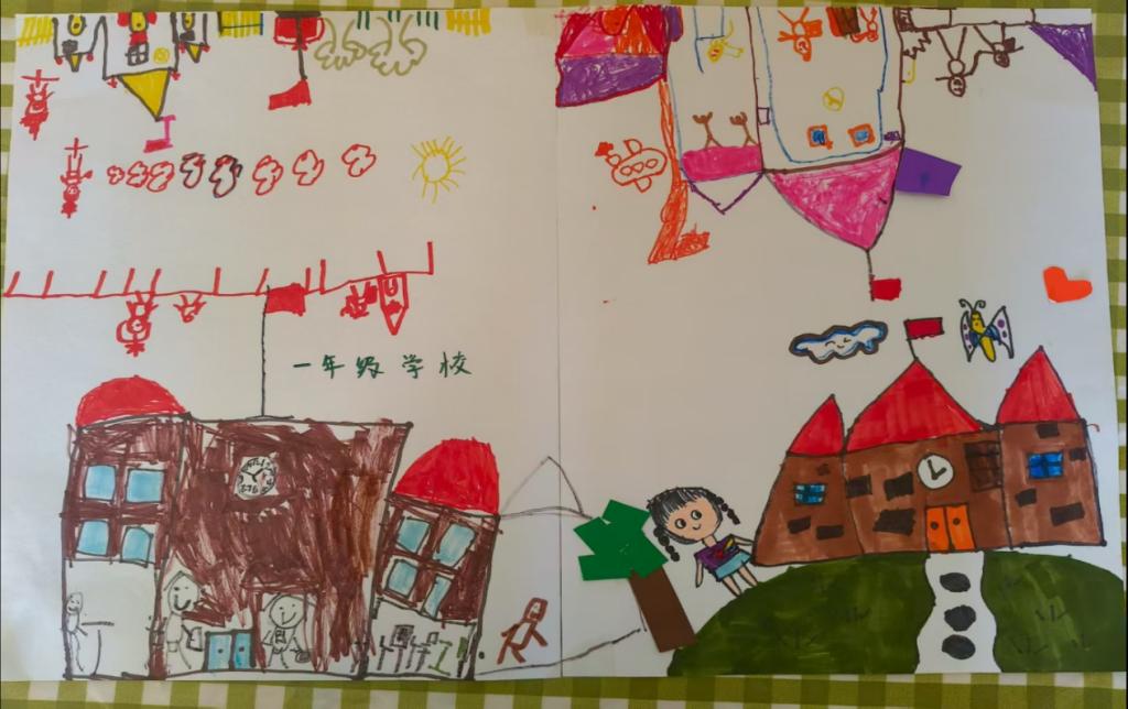 分组绘画后进入作品分享环节,“小讲解员”生动描述画中场景,展现对一年级生活的期待。