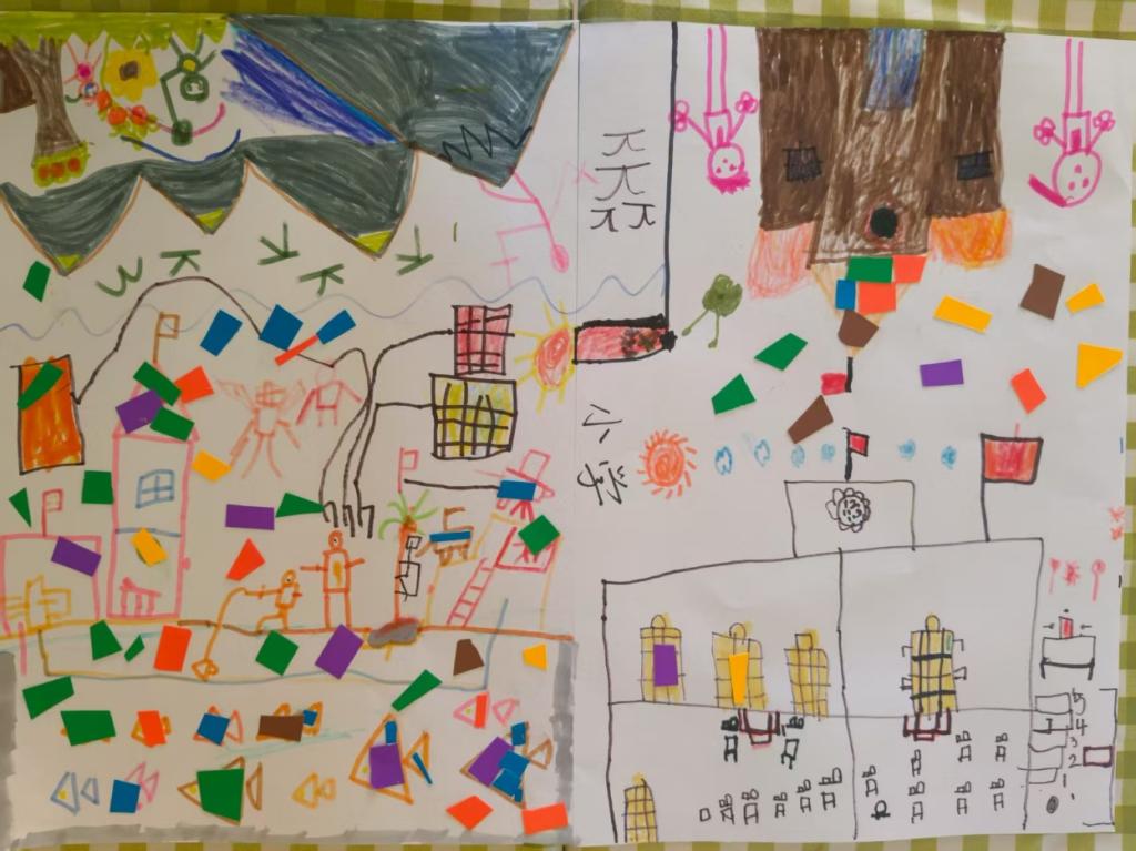 分组绘画中,幼儿自主承担四大角色:设计师(整体构思)、工程师(涂色填充)、讲解员(作品阐述)、命名者(拟定画题),共同完成心中小学的图景。