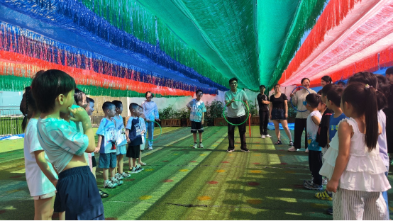 穿越呼啦圈——从5人小组到10人联队,最终全班20人合力传递呼啦圈,层层递进的挑战让幼儿深刻体会“团队中每个人都很重要”同时加强规则意识与遵守规则能力的培养。