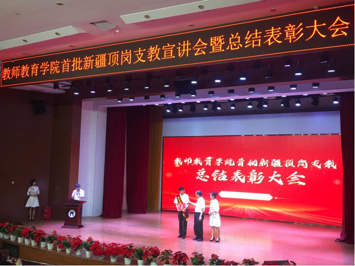 会上对首批新疆顶岗支教学生进行了隆重表彰,42名同学被授予优秀实习生称号,同时还被授予西部顶岗支教先进集体。