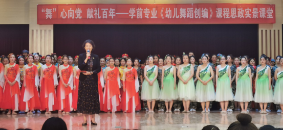 2018级学前本科和2020学前专接本142名同学历经选材、排练、修正,最后全部走上舞台,用一支支充满童心童趣的舞蹈,展示了对中国共产党的敬重与热爱。本次课程思政展演分四个篇章。