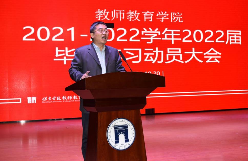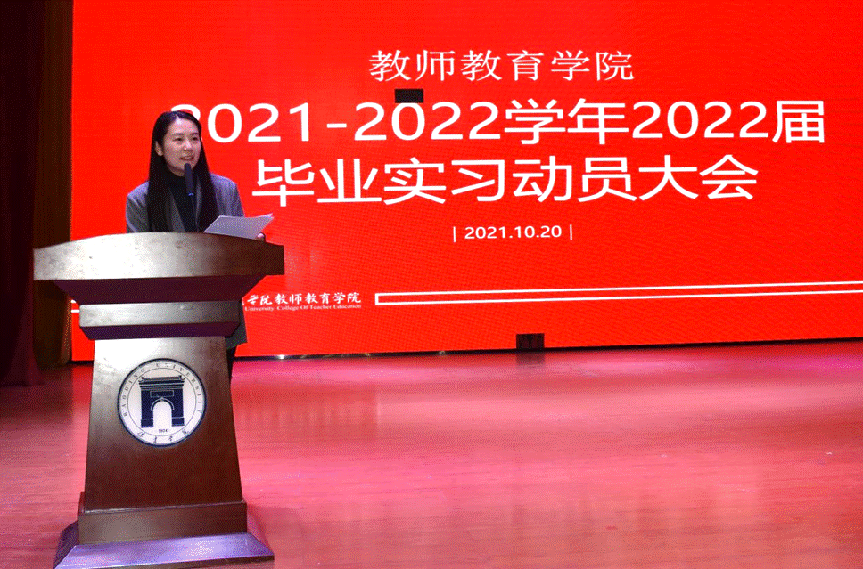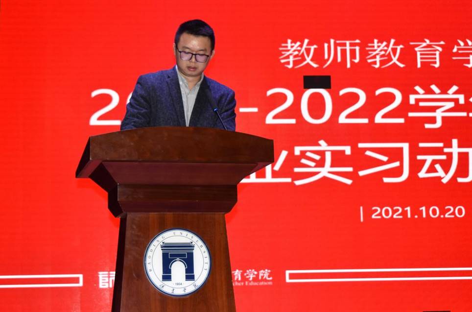 大会共有五项内容。首先由王文清副院长做动员讲话,他强调了此次实习的目的意义以及实习的基本要求。他指出人才培养方案中必不可少的环节就是毕业实习,教育部、省教育厅也要求我们加强教学实践管理。实习的根本意义就是保证人才培养质量。对师范生个人来说意义也非同一般,实习是为了检验自己所学的理论以及技能,培养同学们的实践能力、师德体验、教育情怀。为了保证实习质量,学院对实习基地做了勘察,同时,为同学安排了双导师,分别是实习单位的一线教师和校内本专业教师。王文清副院长要求同学们在业务上做到三多,多观察、多思考、多总结。