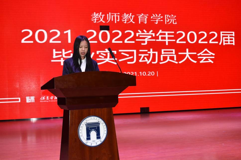 第三项由2018级小学教育专业理班学生代表闫晓雨发言,她表示一定严格遵守实习期间的各项规章制度,尊敬领导和师长以及见习单位的每一个人。在实习中提升自己,将理论与实践有机结合。